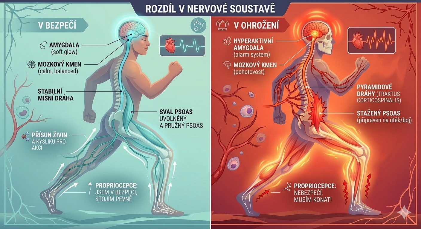 Když tvůj systém vyhodnotí ohrožení (nebo potřebu se vymezit), signál nezačíná v logickém mozku, ale v amygdale. Ta okamžitě aktivuje mozkový kmen, který vysílá impulzy dolů k míchu. Cílem je připravit tělo na akci – a k akci potřebuješ právě nohy.