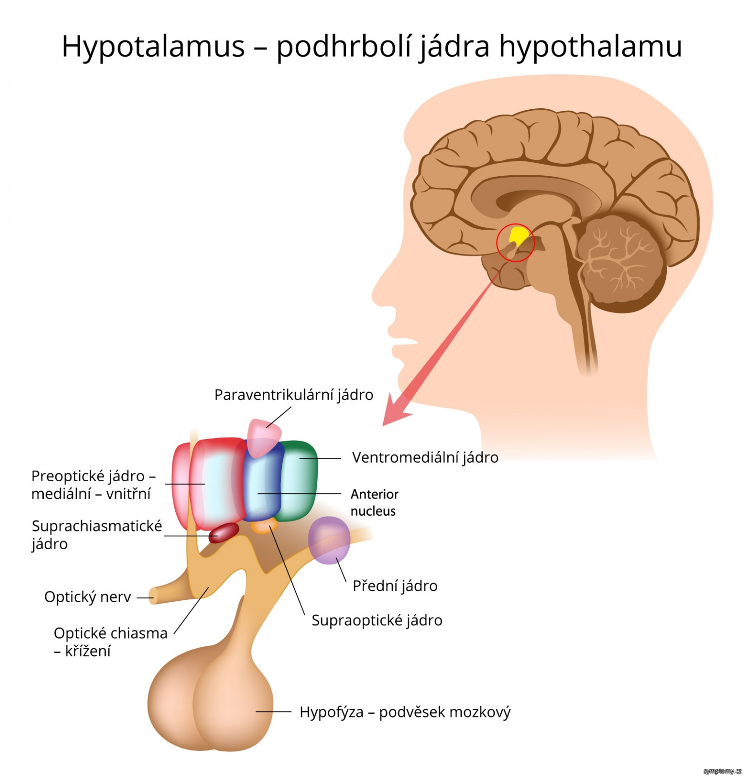Hypothlamus - Hypofýza - rozhraní nervové a hormonální soustavy. Nevyšší centra řízení, centrální počítač těla, odtud se rozhoduje, zda zůstanu zdravá či nemocná